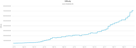 As for the difficulty level, the total hashing power of the miners has followed until now an almost continuous exponential growing trend, with a floating point representation for the difficulty () that from an initial value (corresponding to the easiest target) has reached the value on 13 July 2017. These and other statistics about the Bitcoin blockchain are easily available on-line through a blockchain explorer, a web service designed to offer human-readable views of a blockchain (e.g., [50,51]) or some other related services (e.g., [52]). Please, see Section 3.3.2 for details on how difficulty is computed and Section 4.1 for some more recent statistics on the Bitcoin network and their implications.