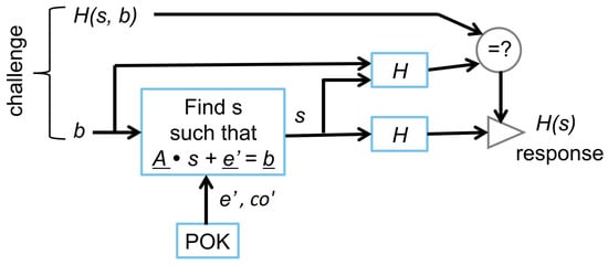 Since the adversary is not able to solve the LPN problem, the check together with the conclusion that led to a proper solution of the LPN problem by using the bits in the POK-generated vector implies that only the LPN-based PUF itself could have generated and, hence, the challenge. This means that the LPN-based PUF must have selected and produced the inputted challenge with during an execution of . We notice that vector can only be recovered if in the execution of equals in (1). We conclude that is now able to generate the correct response (since must have been the response that was generated by the LPN-based PUF when it computed the challenge with ).