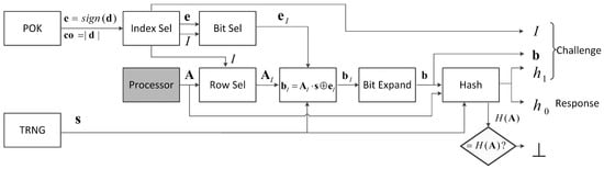 The processor feeds the rows of one by one into the hardware. By using a bit select module based on set , the hardware extracts and feeds the rows of to a hardware matrix-vector multiplier. The hardware matrix-vector multiplier takes input matrix , an input vector generated by a True Random Number Generator (TRNG), and , and computes . We set all bits for to generate the complete vector of m bits. This masking trick has the advantage that no unnecessary information is given to the adversary (and will allow us to have a reduction to a very short LPN-problem). After is constructed, hash values and are computed. The challenge is with response .