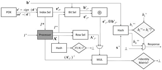 The processor computes and transmits to the hardware matrix-vector multiplier the inverse matrix of matrix . Next, the rows of matrix are fed one by one into the hardware and its hash is computed and verified against . The rows corresponding to submatrix are extracted (using a bit select functionality based on ) and the columns of are fed into the hardware matrix-vector multiplier one by one. This verifies that and are inverses of one another (the equal identity matrix box in Figure 4 verifies that the columns of the identity matrix are being produced one after another). The correctness of matrix is guaranteed by checking whether the hash of matrix matches the hash value (as was done in ). The correctness of implies the correctness of (since was fed as part of into the hardware). Therefore, if all checks pass, then is indeed the inverse of a properly corresponding submatrix of the matrix used in . (The reason why this conclusion is important is explained in Section 5.).