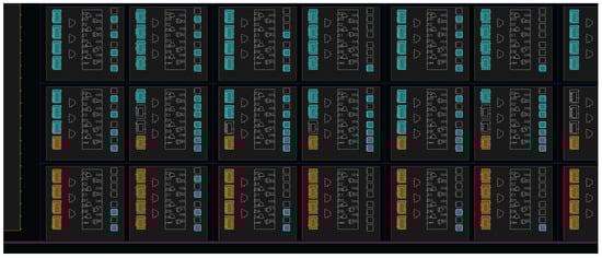 In this figure, we magnify the area at the left bottom corner in Figure 5. We only highlighted the LUTs implementing RO arrays as orange blocks. Each LUT is implemented as one inverter. Therefore, they are 5-stage ROs, and they are placed manually in adjacent columns on the FPGA.