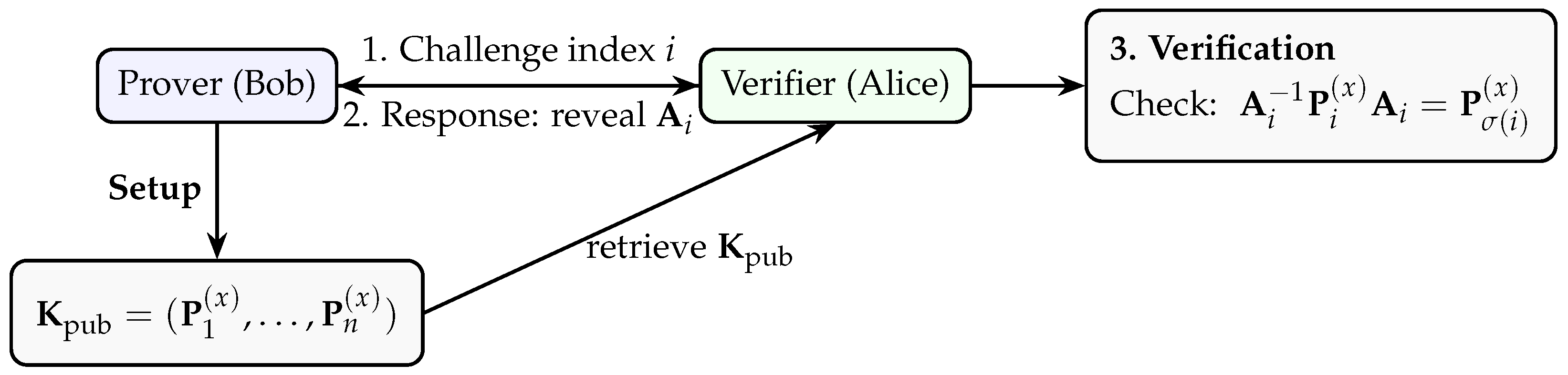 We work over a finite field with a cryptographically large prime p, and we consider matrices of size . The secret state held by a prover consists of