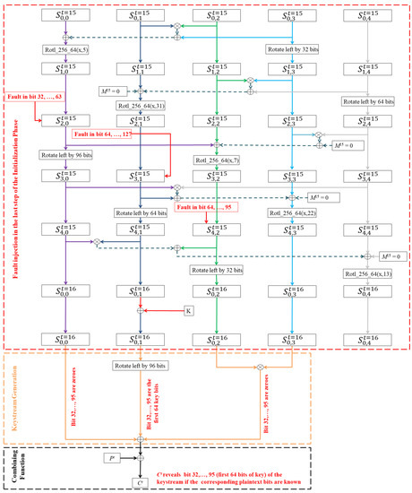 We observe that during the 16th step (last update step) of the initialization phase, destroying the last 64 registers (i.e., register 64 to 127) of state element will result in all zero bits in the state element . This is due to the fact that at the fourth round of each step, the contents of are rotated left by 64 bits. The left rotation will bring the zero valued contents of the last 64 bits (faulty bits valued zero) into the first 64 register bits of state element . Since the last 64 registers are permanently set to zero, the rotation will not have any effect on these bits. After the left rotation there are no changes in the state element for that step, i.e., .