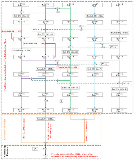 In addition, in Equation (5) observe that and are multiplied bitwise and used in the ciphertext computation. Therefore setting bits of either of these two state elements to zero will eliminate the effect of both in the keystream computation. To introduce zero valued contents in bits of state element , one can permanently set bits of state element to zero, i.e., destroy the corresponding registers. At the fifth round of each step, contents of state element goes through a left rotation of 32 bits. The left rotation will bring the zero valued contents of state bits (faulty bits) into the register bits of state element . The left rotation will not have any effect on the register bits due to the permanent fault. As a result bits of state element will be set to zero, which will eliminate the effect of state and in the keystream computation.