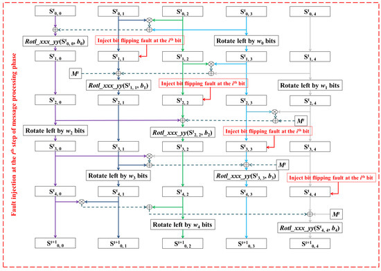 To perform a forgery attack on the message , the adversary can apply bit flipping faults to the ith bit of the state elements , , and . This is equivalent to modifying the input message block from to at the sender’s device, where the modification is a complementation of the ith bit of the original input message block . Figure 4 illustrates the locations of the fault injections to achieve the fault-based forgery attack on MORUS.