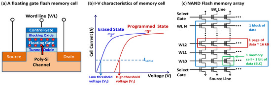 (a) A floating gate (FG) NAND Flash memory cell which stores charge in the FG. Metal word-line (WL) act as the control gate of the FG transistor. Information’s are stored in the FG through tunneling of electron from Si-channel to FG. Blocking oxide prevents back tunneling of electron to control gate. (b) Typical current-voltage characteristics of a Flash memory, (c) The hierarchical storage in NAND Flash array consisting of kilo-bytes of memory cells and the WL electrically connects those cells (called a page of information). Each block consists of multiple WLs. The select gate transistors can be standard MOSFET or FG transistors, depending on manufacturer or technology node.