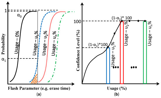 Figure 2 shows our recycled Flash identification approach. We measure several Flash characteristics (such as erase time) on different memory location of a chip in order to plot the variation of that parameter within a chip. Then, we compare the same Flash characteristics as a function of memory usage as shown in Figure 2a. The figure shows that the upper tail (CDF) of Usage-0% intersects the lower tail (CDF) of Usage-% at , so the confidence level to detect % usage is () * 100. Whereas, the intersection point () for Usage-0% and Usage-%, is = 0 and so, the confidence level to identify a used Flash chip is ∼100%, when the Flash memory is used for % of their lifetime. Here, Alpha () defines the cumulative probability of the used chip to fall below the threshold of detection (Flash) parameter. From the value of , we can compute the confidence level, which measures whether we can distinguish a recycled Flash chip precisely. Figure 2b shows the confidence level which can be obtained from Equation (1).