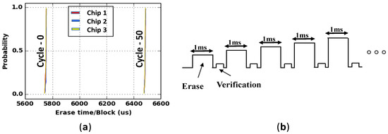 (a) Used vs. fresh Flash chip: timing parameters changes with usage. (b) The erase operation in the NAND Flash takes place in multiple pulses or loops.