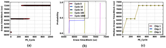 (a) Scatter plot of erase time (Y-axis) with respect to usage (PE cycle count) (X-axis), where PE cycle count is 1000 and for each PE cycle count, we have used 100 blocks to obtain the scatter plot, (b) Cumulative Distribution Function (CDF) of Erase time for cycle 0, 10, 16, 100, and 1000, and (c) Median erase time per block (Y-axis) with respect to usage (X-axis).