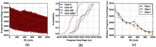 (a) Scatter plot of program time (Y-axis) with respect to usage (PE cycle count) (X-axis), where PE cycle count is 1000 and for each PE cycle count, we have used 100 blocks to obtain the scatter plot, (b) Cumulative Distribution Function (CDF) of program time for different PE cycle count. (c) Median program time per page (Y-axis) with respect to usage (X-axis).