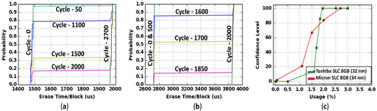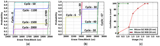 (a) CDF of erase time for PE cycle 0, 50, 1100, 1500, 2000 and 2700 for Micron 8GB SLC (34 nm). (b) CDF of erase time for PE cycle 0, 33, 41, 47, 58 and 70 for Micron 32GB MLC (20 nm). (c) The confidence level for two types Flash chips—SLC and MLC.