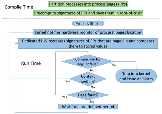 To better understand the overall process starting from the preparation of the golden hashes to the verification of code integrity at run-time, we present the flow of our technique in Figure 2. The overall method is divided into two general phases, a compile-time phase and a run-time phase. During the compilation phase and after the target process has been compiled into its equivalent binary, the executable code of the process is partitioned into pages as defined in its Executable and Linkable Format (ELF) file []. The content of every page (4 KB) is hashed using a secure cryptographic algorithm to generate a golden signature of the page (in the case of the Secure Hash Algorithm SHA256, the generated hash is a bitstream of 256 bits). Due to the avalanche effect provided by the cryptographic algorithm, any bit change in the page content will result in a significant change in the generated hash of that specific page. The generated hashes are stored and indexed into a database in a secure and trusted location (e.g., a software or hardware root-of-trust []).