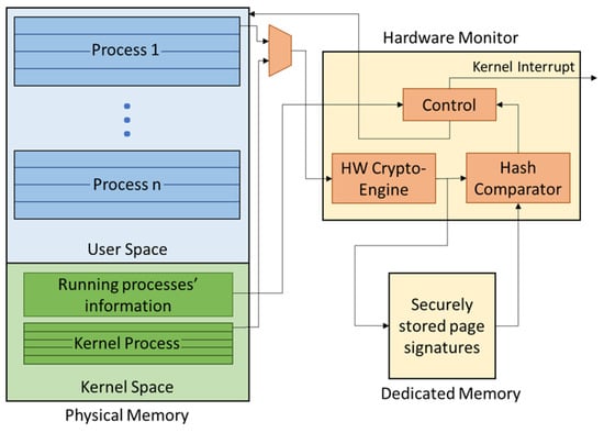 At run-time, when the process is loaded into memory, the kernel notifies the hardware monitor of the process pages’ locations in memory. This is accomplished by inserting a monitoring kernel process that extracts the memory maps of the target process and translates the virtual addresses of the pages to their corresponding physical addresses and page frame numbers (PFNs) before sending them to the hardware through a communication port set up between the hardware monitor and the kernel. Once the hardware is aware of the locations of the process’s executable pages, the monitor grabs the content of every page utilizing a direct memory access (DMA) controller. The content of each page is then passed through a hardware (HW) crypto-engine, and a run-time hash of the page is generated. The newly generated hash is compared to the same page’s golden hash as retrieved from secure storage. Currently, the comparison is performed by string matching. However, if faster implementations are required, it is possible to consider techniques that only look for similarities between the golden and regenerated hashes especially since a single bit change in the page contents will result in a significant change in the regenerated hash. The process of regenerating and comparing hashes happens in the hardware monitor and thus is immune to any of the software attack types defined in our threat model (see Section 4).