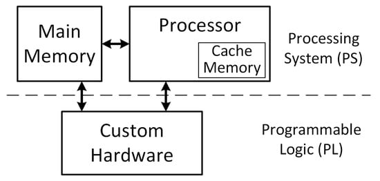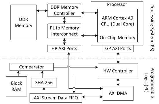 To implement our proposed approach in an embedded system, we target a generic architecture similar to the one shown in Figure 4. Our proposed approach is implemented in custom hardware and interfaces directly with the processor and its main memory. The operating system running on the processor is modified to include a kernel-level driver that interfaces with our custom hardware. In turn, the custom hardware includes components that control the interface with the processor and allow for direct memory access to the main memory and cache. In addition, the hardware is responsible for generating run-time hashes of the process pages, comparing the hashes to the golden references and interrupting the kernel in the case of a hash mismatch. It is important to note that the custom hardware could be an Application Specific Integrated Circuit (ASIC) or a Field Programmable Gate Array (FPGA). Obviously, each of the different architectures provides distinct advantages and disadvantages. For example, implementing our proposed technique on an ASIC chip would provide faster hardware components at the expense of the modularity provided by FPGAs. In particular, having our architecture implemented on an FPGA provides the ability to perform different architectural decisions such as choosing different hashing algorithms during a product’s lifetime depending on the needed security of the application.
