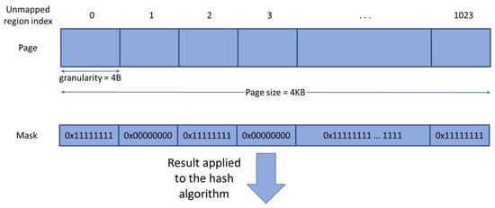 By analyzing the paging process of the Linux OS, we realized that executable code is typically placed in a set of contiguous pages. However, the size of the code in is rarely a multiple of the page size ( in our case). Thus, in most cases, the last page of an executable code would have some unmapped regions. To allow for correct hash generation during compile-time as well as run-time, we devised a technique where the unmapped page regions are masked with a set of binary zero values before being passed through the hash generator as shown in Figure 5. We start by dividing the page to a set of regions according to a predefined granularity. The granularity can be set per application to allow for increased security at the expense of performance. For example, as shown in Figure 5, the granularity is set to . Thus, the page is divided into 1024 regions. If, for example, regions 1 and 3 are unmapped, the page is masked such that those regions’ binary values are ignored and substituted by zeros prior to being input to the hash generator.
