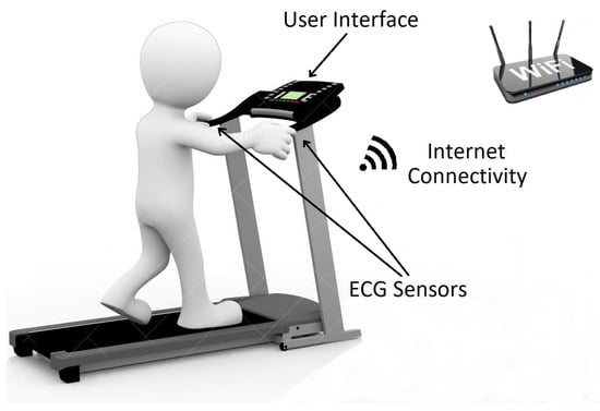 Heart monitors typically measure a person’s heart activity, such as rate and rhythm, and may take the form of a small embedded handheld or portable device. Figure 6 shows an example scenario where an embedded medical system is attached to a treadmill in an exercise facility. The medical device monitors the heart rate activity of an individual while exercising. The person’s electrocardiogram (ECG) signals are measured using grip-style dry electrode sensors [] mounted on the handlebars of the treadmill. The captured ECG data is then used to find the person’s heart rate. The calculated heart rate is displayed to the individual in real time. The embedded system is also internet connected to allow for syncing the user’s data with the cloud to perform long-term analysis and health diagnosis.