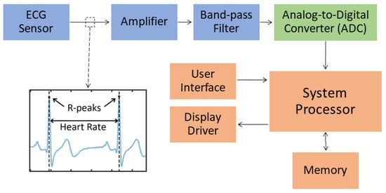 A heart monitor block diagram composed of electrocardiogram (ECG) sensors, amplifiers, filters, analog-to-digital converters (ADCs), a system processor, a memory, a processor interface, a display driver and a user interface.