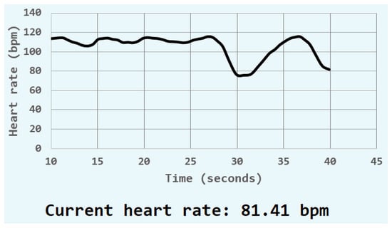 A heart rate monitor displaying a person’s current heart rate with a value of 81.41 bpm along with the person’s heart rate history over the past 30 s.