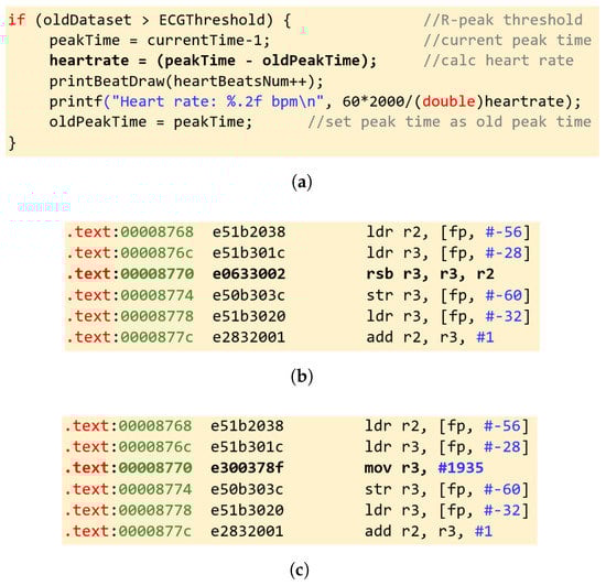 Figure 9a shows a code snippet from the original heart rate monitoring application in the C language listing a series of instructions where the heart rate is calculated by subtracting two consecutive values of the ECG R-peak. The heart rate is then displayed to the user. The subtraction instruction is shown in boldface in Figure 9a. Figure 9b shows the equivalent binary code of the compiled and assembled instructions targeting the ARM assembly language. The corresponding assembly subtraction instruction (rsb) is shown in boldface in Figure 9b. Finally, Figure 9c shows the binary code of the attacked application with the first variation of the malware where the rsb instruction is substituted by the mov instruction. The effect of this change masks the result of the calculation logic of the heart rate monitor leading to the generation of a perfectly normal heart rate value instead of the user’s actual heart rate even if the user is having symptoms of a heart failure, thus potentially hiding the need for immediate medical help. The other variation where the rsb instruction is substituted by the add instruction would make the heart rate calculation display inaccurate values, potentially causing unnecessary efforts by the individual to seek medical help.
