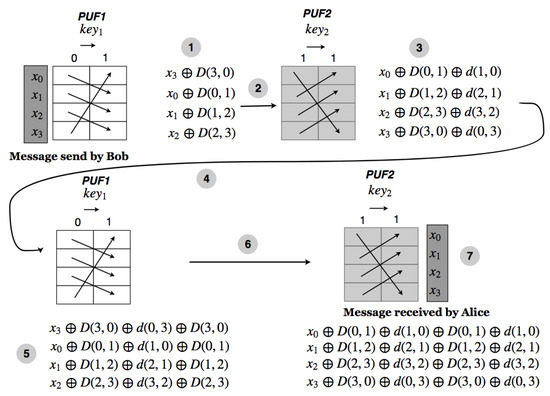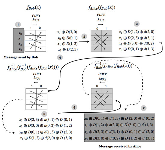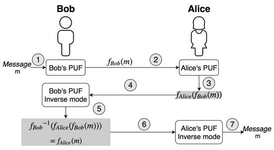 Figure 1 shows our proposed PUF-based general encryption protocol which depicts Bob as the sender and Alice as the receiver. Both Bob and Alice have their own PUF. If Bob encrypts his message m with his PUF as , Alice has no way to decrypt it except to ask Bob to decrypt it for her. The following protocol overcomes this asymmetry: