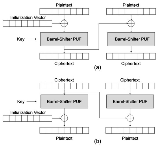 The technique of cipher block chaining (CBC) is typically applied in block ciphers such as AES [11]. Like AES, BS-PUF encrypts a fixed number of plaintext bits. Thus, it can be viewed as a block cipher. A practical barrel shifter or permutation network implementation might consist of 128–1024 bit blocks.