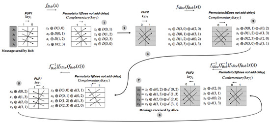 - Step 5: Apply to .Decryption follows a similar process. However, the direction of message transmission is reversed and the inverse permutations are used. Physical invertibility recovers the original forward delay vector in the reverse direction.Thus, is rearranged by Bob’s permutator first. This is . This rearranged result is given to to resulting in .Transmission gates show symmetric delays for forward and backward paths; always equals . Thus, the delay terms cancel. The result after applying is equal to .