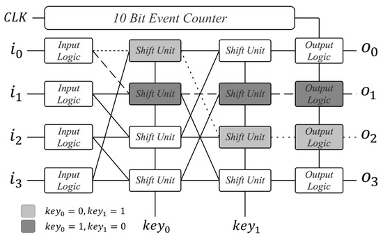 Each shift stage is logically similar to an arbiter PUF stage. Barrel shifter PUF is designed to implement rotation functions. Key bits determine the shift amount . Thus, is applied from LSB to MSB, from left to right. Figure 7 provides an example; encodes for right shift by 2 in the second stage. Consequently, the same text bit traverses a different path providing a different delay value for different keys.