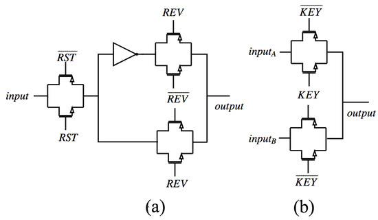 Shift units implement the path selection and form shift stages. A shift unit schematic is shown in Figure 8b. Either inputA or inputB is mapped to the output. The mapping is determined by the key. A key value of 1 causes the upper transmission gate to open; output then becomes inputA. Otherwise, output is driven by inputB.