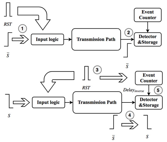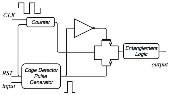 Output logic is added to capture path delay . An event counter is initialized to 0. The RST signal simultaneously starts the event counter and releases the input message. The delay is captured by reading the event counter when the output logic detects a voltage transition. Finally, an entanglement block in the output logic entangles delay with the message bit.
