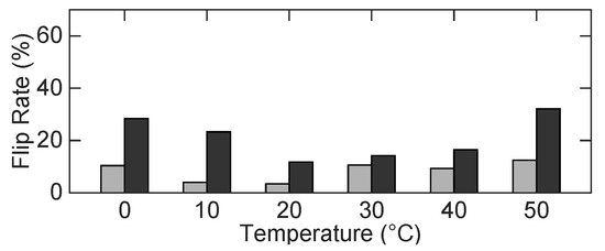 Percentage of bit flips under temperature variation. Flip rates demonstrate signal-to-noise ratio (SNR) under different temperatures. Flip rates of LSB are shown in dark grey. Flip rates of 2nd LSB are shown in grey. The flip rate of LSB is much higher than 2nd LSB.