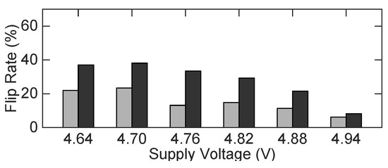 A higher order bit could be selected. It would have comparatively better flip rates, but reduced variability. Many feasible techniques exist to compensate for temperature and voltage variation [27,28]. These techniques would be helpful at the flip rates expressed by the 2nd LSB. Thus, the advantage of choosing a higher order bit is minimal. All of the following evaluations are performed on the 2nd LSB only.