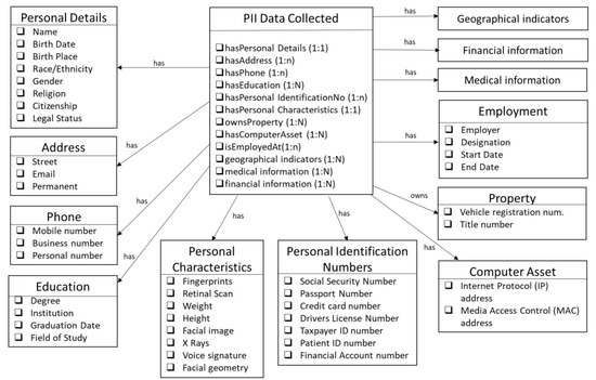 (2) PII Data Collected: This class identifies key attributes that comprise personally identifiable information. These include personal details like names, contact information, like address, phone numbers, identity numbers and identity characteristics. These are illustrated in detail in Figure 3. Other PII data includes employment, medical, financial and education details of a person. To identify the key properties of these classes, we referenced the NIST special publication 800–122 [19].