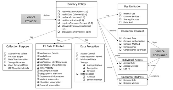 The main classes of the ontology are illustrated in Figure 2. Referring to the NIST guidelines on cloud privacy [17] and PII information [19], we have identified the key components of a privacy notice that are defined as object properties in the main Privacy Policy class. The numbers in the brackets indicate the relationship with the class of the functional property. Therefore, each privacy policy should have one instance describing the collection purpose and data protection controls; privacy policy should have at least one instance of consumer consent and Access to own PII, and so on. The main sub-classes are