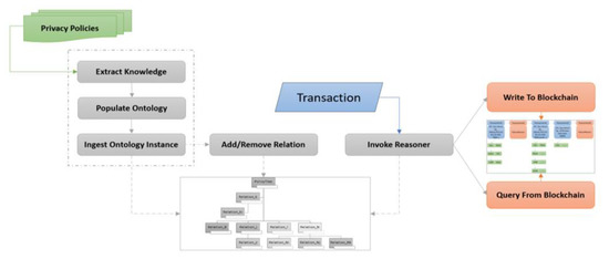 We have implemented semantic reasoner in our system mainly for two reasons: 1. Analytics: Semantic web technologies can help drive analytics on the system. It enables the scope to access, filter, search and analyze privacy policy ontology. It can be used to change the underlying privacy policy ontology in any type of changing requirement. Moreover, it can be used to relate concepts and relationships across the classes of the ontology. 2. It helps drive the reasoning system which flags every data transaction as valid/invalid with respect to the underlying privacy policy. To make sure that only a restricted set of permissible actions (as per the privacy policy) are enforced upon the PII data entities, we have designed a special purpose sub-system within the system which works along-side the blockchain ledger and populates it with transactions marked as valid/invalid. These replace the traditional mining operations, which are extremely costly and performance inhibitive. With this semantic web-based implementation, each piece of data as per the privacy policy has their own set of varying levels of access. The underlying privacy policy governs the set of all permissible actions, and the end-user and the service provider can set/reset the access level classes as per the policy rules and guidelines. The semantic web reasoner handles the validity of these set/reset of access level classes.