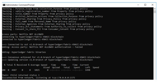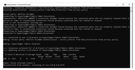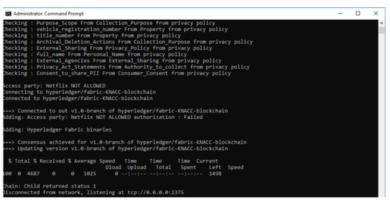 - Data sharing is partially permitted: Here, depending upon the PII fields present in the data transaction, and based on the policies that allow such PII to be a part of the data transaction but not wholly involved, the reasoner will still deem the data transaction to be valid since it is the default selection and proceed to perform Write operation on blockchain with the PII fields and transaction ID. E.g., consider a use case of sharing some PII data by the service provider (Netflix) with trusted 3rd party {PII fields: FirstName, LastName, CreditCardNumber}, the execution of this scenario in the prototype system is shown in Figure 9.