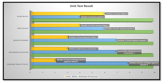 In case of consuming privacy policy, pass/fail was determined by how robust the system is in handling RDF and OWL-based privacy policies; Add/Remove relations were run through adding viable and conflicting relations, and hence Reasoner shares similar result. Write to blockchain reflects the number of illegal and legal transactions it handled. Query blockchain shows the actual pass/fail numbers, i.e., out of 10 queries, it could successfully handle 4. ChaincodeInvokeOrQuery invokes or queries the chaincode and if successful, the INVOKE form prints the ProposalResponse to STDOUT, and the QUERY form prints the query result on STDOUT. The absence of standard output or error in connecting to running blockchain was considered as Fail. We can see that it is during the Query phase that we encounter failures. During experimentation, we found out that the error was caused by permission denial errors, which can be attributed towards the number of different accounts we used to query the blockchain. Writes were allowed only when the blockchain permission and Reasoner both allowed a Write operation. The performance evaluation results are shown in Figure 11.