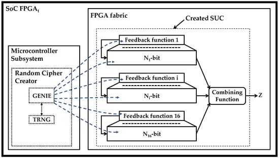 - The GENIE selects randomly, for each NLFSR, a feedback function from a pre-defined set and loads it to the corresponding area in the FPGA fabric. Also, the GENIE generates a random initial state for each NLFSR.