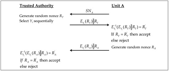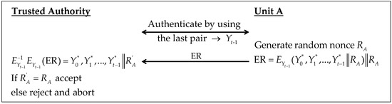- The TA selects the next unused and generates a random nonce . Then, encrypts with a standard cipher by using as a key and sends it concatenated to as . Unit A generates the next response and decrypts the received message as . If , unit A rejects TA and keeps its state . this retains system synchronization. Otherwise, and TA is authentic.