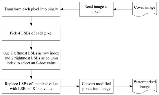 In the proposed watermarking algorithm, proposed S-box over subgroup of was used to transform the LSB’s of each pixel of the grayscale image. We will insert watermark in images based on modifications to the LSB’s of the pixel values which will not affect the quality of the image. Figure 5 gives a description of the watermark embedding algorithm, while the watermark extraction algorithm remains the same.