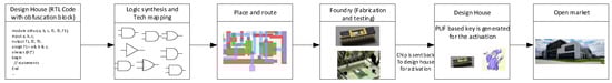 In Figure 1, the design and fabrication flow is shown for a prevention method of piracy and overproduction of chips using a PUF-based method. The designer uses logic synthesis, technology mapping, and place and route tools to produce a graphic database system II (GDSII) file that can be sent to the fabrication facility. Fabricated chips will be manufactured and tested at the foundry and will be sent back to the design house for activation. The design house will activate the chip using the PUF-based key and will send to the market for sale.