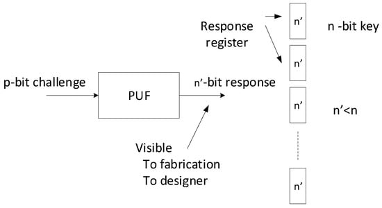 Assume that the PUF generates an n-bit response given a p-bit challenge. As the designer, instead of characterizing the entire p-bit input space of the PUF, we only need to find one PUF input that matches the desired key of the locked circuit. Assuming a truly random PUF, on average, that will take brute force tries, rather than the challenges needed to characterize the entire PUF. As n gets large, however, even that can become difficult. Therefore, instead of using a n-bit PUF, we use only bits of the PUF output, where . In order to generate the key, we issue challenges, where each response is stored in a -bit sub-key register. The S sub-keys together form the n-bit key K: