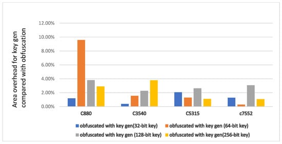 Area overhead for obfuscation with key generation for different benchmarks with varying key size.