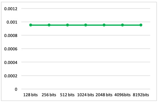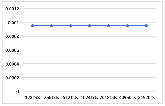 In what follows, we show the implementation that is changing the content of the plain text. Suppose the encrypted result equals , where . Moreover, we present necessary times for encryption, verification, and decryption, in the case of the plain text length being changed to 128 bits, 256 bits, 512 bits, 1024 bits, 2048 bits, 4096 bits and 8192 bits, respectively.