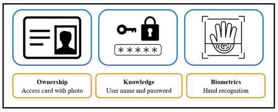 A one-time password method is used to generate one password for each user login request. This method is applied in many systems [21]; however, its main problem is repetition and it is uncontrollable. In recent years, authors have proposed MFA schemes, and they began by introducing biometrics (physical and behavioral) into authentication schemes—for instance, voice biometrics, face recognition, methods of eye recognition (iris recognition and retinal recognition), hand geometry, fingerprint, electrocardiographic (ECG) recognition, electroencephalographic (EEG) recognition, DNA recognition, etc. There was a problem with regards to biological agents, which was difficult to modify, and this caused security issues in the system.