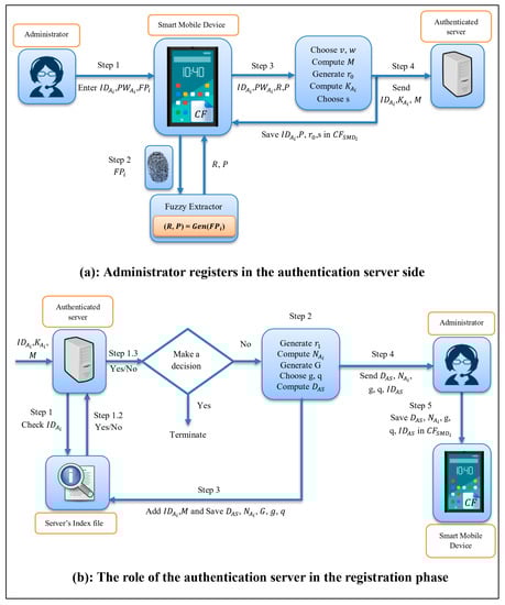 In this section, we propose a strong multi-factor authentication protocol based on the password and the user’s fingerprint in the Internet server system and depended on an application in a smart mobile device. Our protocol includes three main elements—Authenticated Server () such as cloud service provider, Administrator (), and Smart Mobile Device ()—and is divided into four phases: registration, login, authentication, and change password. The registration phase is implemented only once, while the login and authentication phases are performed whenever needs to log into the system, and the change password phase works at the moment when wishes to change the password.