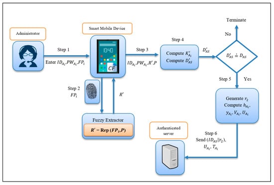 - We design a secure and robust protocol for authenticating the legal administrator that can play the main role for management of IoT devices in future work or server–client systems. This work has positive features such as mutual authentication, once-secure session key for each login phase, the anonymity of password and biometric, unlinkability, and security against a stolen smart mobile device and online change of password.