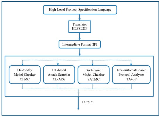 The protocol was implemented in HLPSL (the High-Level Protocol Specification Language) language, and, after the protocol as written, a HLPSL2IF translator converted this code into an Intermediate Format (IF) [41,42]. The steps of back-ends are as follows: