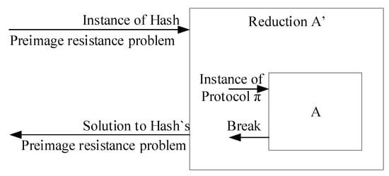 Let us assume that a polynomial time adversary runs an algorithm that can compute the inverse hash with a probability . The adversary constructs an efficient algorithm using the algorithm as a subroutine (see Figure 3). The new algorithm is entitled "reduction", and it attempts to solve preimage identification problem. This leads to an adversary; compute as follows: