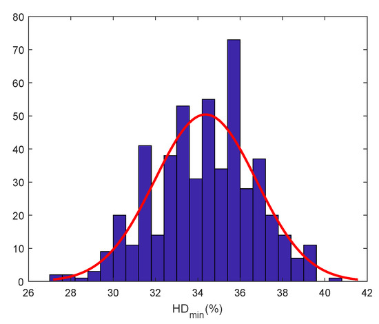 Distribution of fractional Hamming (minimum) distance for 500 IDs.