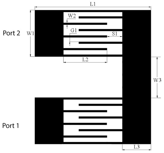 Here, n is the number of fingers (6 in this case), and W1 is the line width (3 mm) of the microstrip interdigital resonator, as shown in Figure 1. The interdigital capacitance affects the center frequency of the designed filter, which classifies the interdigital notch filter as a semi-lumped element device. Furthermore, the center frequency of the filter can be tuned by varying the number of fingers (n) and the gap spacing S1. Using (1), we were able to derive an accurate capacitance value that enabled each of the filter structures to be tuned to a specific rejection frequency.